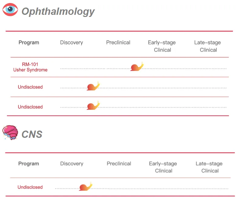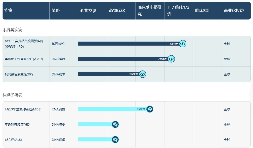 辉大基因成立于2018年,公司利用其专有的HG-PRECISE平台来发现、设计和开发新的CRISPR基因疗法,公司临床阶段项目包括HG004治疗RPE65突变相关遗传性视网膜疾病(已获得FDA授予ODD和RPDD双认定),已开展全球首个人体研究“LIGHT光”(NCT06088992)和中国首个同一主方案开展全球多中心临床1/2期研究“STAR星”(NCT05906953);HG202(全球首个进入临床的CRISPR/Cas13 RNA编辑疗法)治疗新生血管性年龄相关性黄斑变性(nAMD),已开展首次人体研究 “SIGHT-I目”(NCT06031727)。临床前基因编辑管线包括HG204(RNA编辑疗法)治疗MECP2 重复综合征(MDS) (已获美国ODD和RPDD双认定、欧洲ODD认定)、HG302(DNA编辑疗法)治疗杜氏肌营养不良(DMD)(已获ODD和RPDD双认定)和HG303(DNA编辑疗法)治疗肌萎缩侧索硬化症(ALS),CRISPR RNA编辑疗法治疗阿尔茨海默病等项目。辉大基因拥有着丰富且深度的知识产权组合布局,正在成为神经和眼科基因治疗领域的领导者。