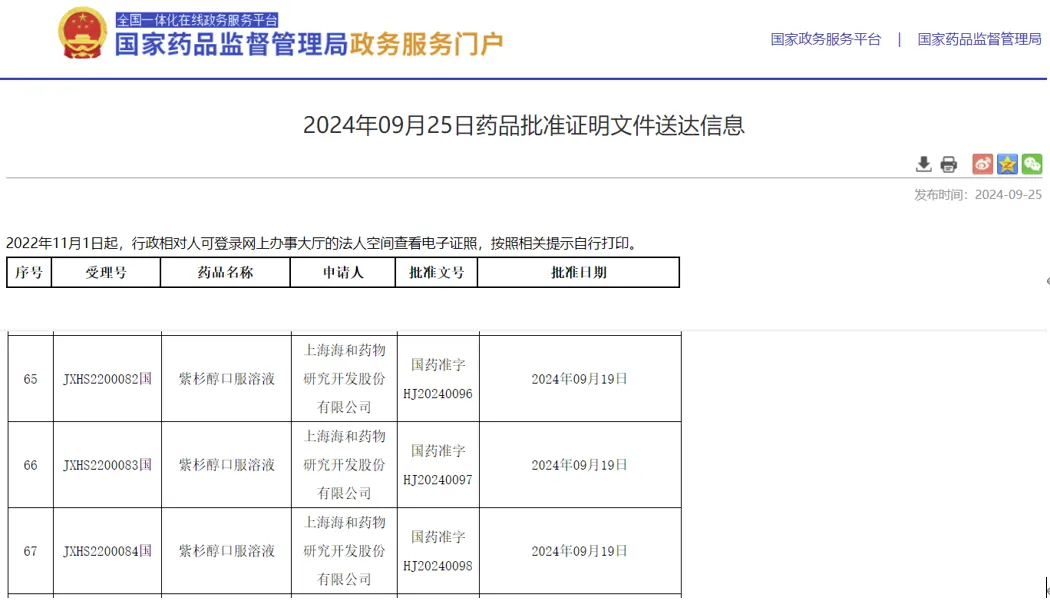 今日,上海海和药物研究开发股份有限公司(以下简称“海和药物”)和韩国大化制药公司(以下简称“大化制药”)共同宣布:双方合作开发的紫杉醇口服溶液(研发代号:RMX3001)获得国家药品监督管理局(NMPA)批准在中国大陆上市;用于一线含氟尿嘧啶类方案治疗期间或治疗后出现疾病进展的晚期胃癌患者的治疗。