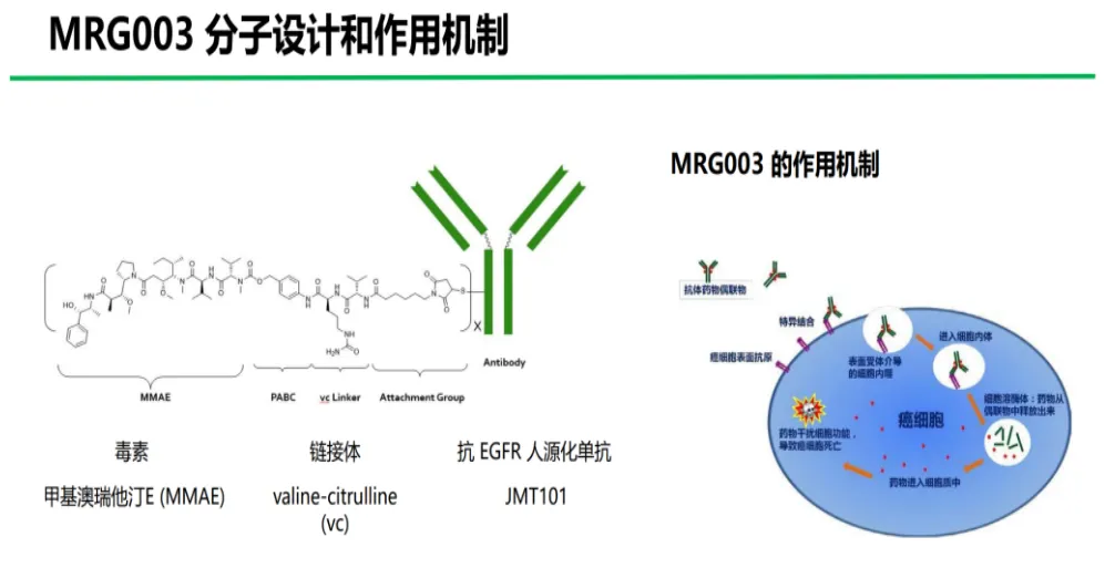 MRG003 是一种由 EGFR 靶向单抗与强效的微管抑制有效载荷 MMAE 分子通过 vc 链接子偶联而成的 ADC。它以高亲和力特异性地结合肿瘤细胞表面的 EGFR,通过内吞进入肿瘤细胞后释放强效的有效载荷,从而导致肿瘤细胞死亡。