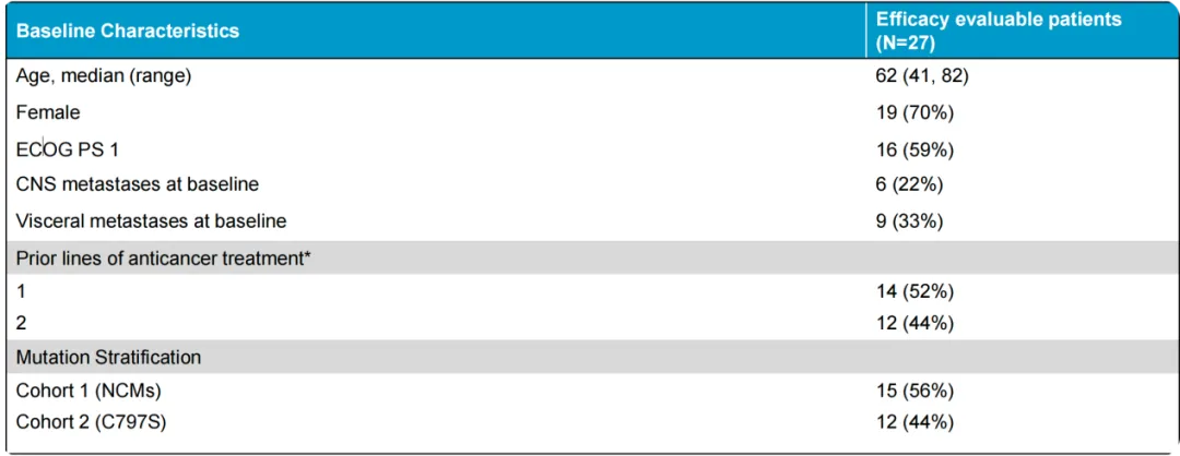 从患者基线上来看,在疗效可评估的27名患者中中枢神经转移的比例为22%,内脏转移比例为33%,过往接触二线治疗的比例为44%,一线治疗的比例为52%,总体上来看,二线治疗这部分患者应该全部接受了三代TKI的治疗。一线治疗这部分患者应该也有一部分接受了三代TKI的治疗。而在突变分层上,第二层的C797S的突变比率达到了44%,与二线治疗比例可以相互印证。这部分患者是三代TKI耐药的主要群体。