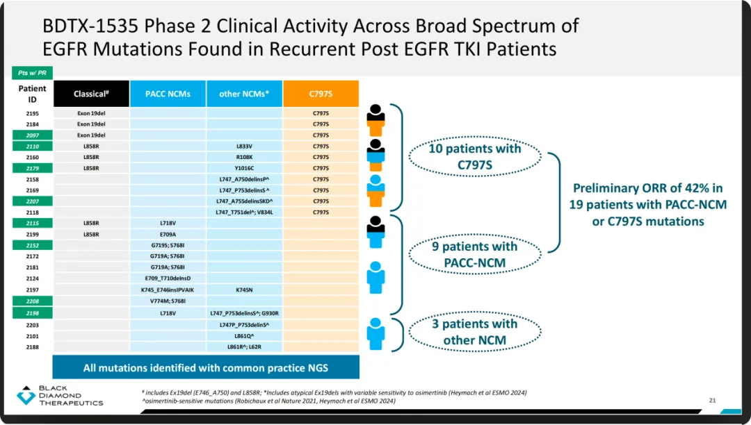 经过了200mg BDTX-1535的治疗后,主要需要关注的自然是那些耐药基因突变患者的疗效。在C797S或者PACC-NCM的突变患者中,初步的ORR达到了42%。这在耐药的患者中,这已经是后线治疗中一个相当惊艳的数字。目前19名患者中,还有14人在维持治疗。