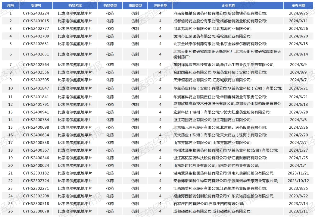 仿制药开发方面,目前国内已有成都硕德药业、石家庄四药、山东新时代药业、山东齐都药业、北京福元医药、浙江花园药业、江西施美药业、福建海西新药等多家药企以新注册分类提交比索洛尔氨氯地平片上市申请,其中成都硕德药业的产品已顺利获批,拿下国内首仿+首家过评。