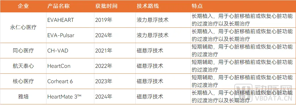 目前,国内已有5款左心室辅助装置(LVAD)产品获得批准,分别来自四家国内企业和一家外资企业。这些产品在技术路线和适用范围上存在显著差异。