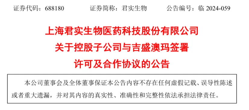 根据许可及合作协议,吉盛澳玛授予君拓生物在大中华区(包括中国大陆、香港特别行政区、澳门特别行政区及台湾地区)基于许可知识产权研发、改进、制造、生产、使用、申报、注册、商业化和以其他任何方式利用IAMA-001小核酸免疫调节剂鼻用喷雾剂型药物的独占许可权利,并与君拓生物在大中华区外合作开发IAMA-001鼻喷剂型项目。