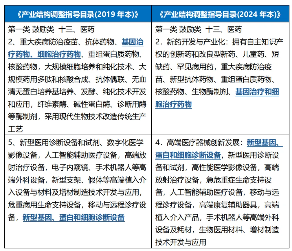 (一)基因治疗和细胞治疗药物、新型基因、蛋白和细胞诊断设备已列于我国《产业结构调整指导目录(2024年本)》鼓励类目录