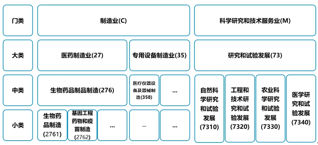 首先,参照适用于在统计、计划、财政、税收、工商等国家宏观管理的《国民经济行业分类GB/T 4754-2017》的规定,经济活动被划分为门类、大类、中类和小类四级。其中,“制造业”和“科学研究和技术服务业”均属于“顶级”的门类,“医药制造业”和“专用设备制造业”均为“制造业”项下的大类,“研究和试验发展”则是“科学研究和技术服务业”项下的一个核心大类,其从属关系如下图所示: