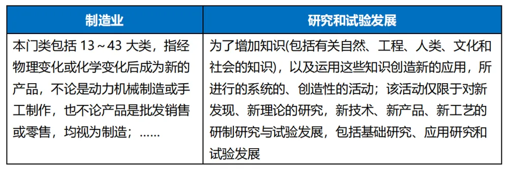 《国民经济行业分类GB/T 4754-2017》针对“制造业”和“研究和试验发展”的定义分别如下:
