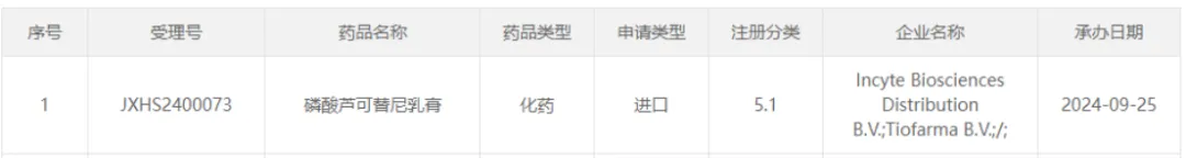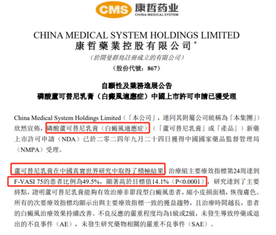 9月25日,CDE承办了磷酸芦可替尼乳膏进口上市申请,受理号JXHS2400073,持有人Incyte Biosciences,从康哲药业公告看出此次申报的是白癜风适应症。