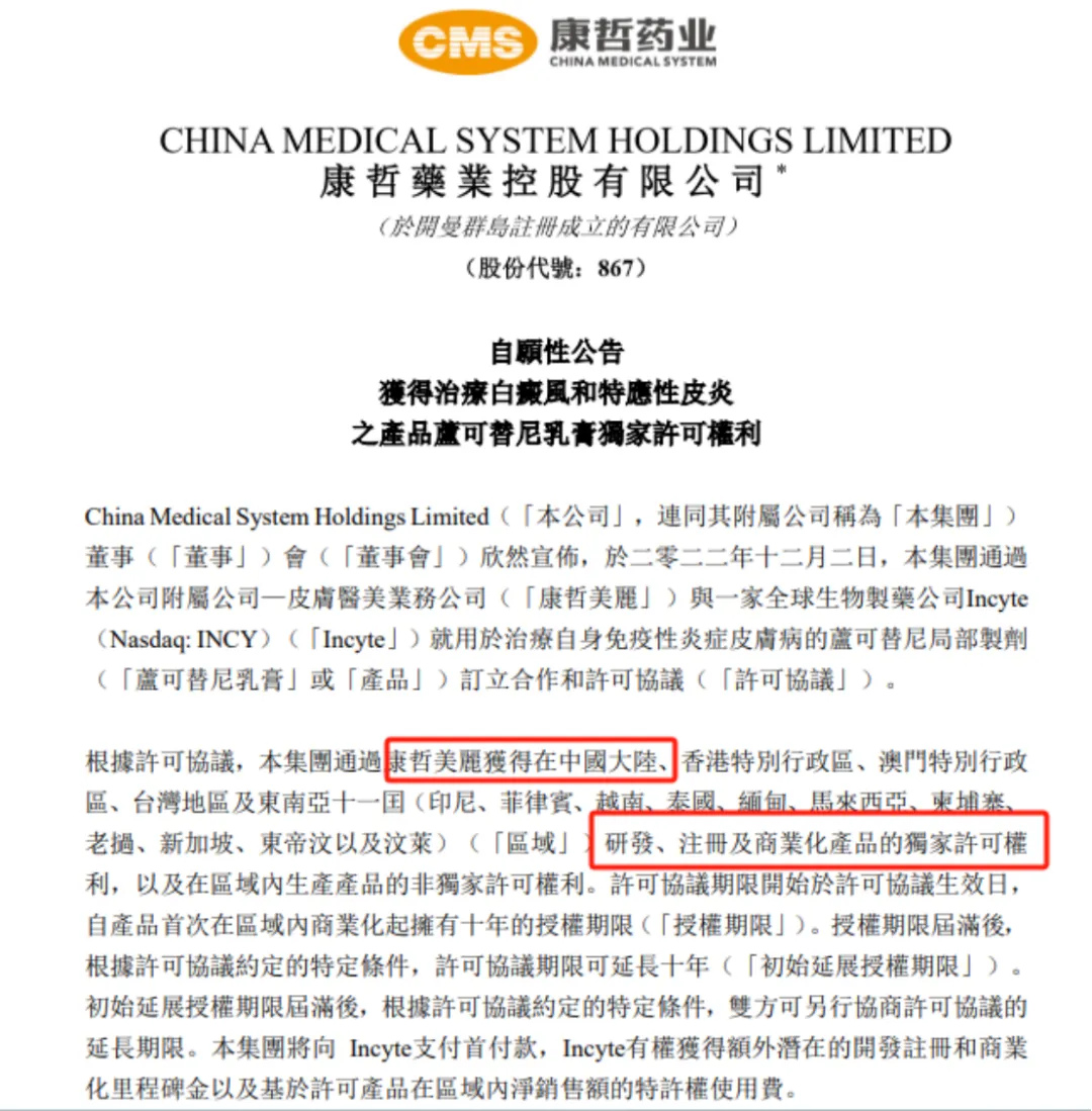 补充一下,康哲药业是2022年底从Incyte引进磷酸芦可替尼乳膏中国权益,算是根据企业(康哲美丽)自身优势和战略发展License in的典型案例之一。