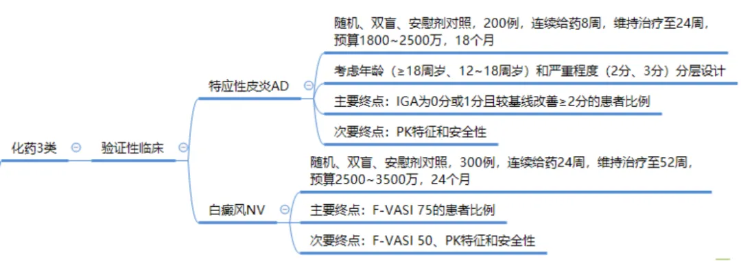 目前原研正在申请进口中,仿制分为3类和4类。临床试验设计与前两年的热门品种克立硼罗做过健康人的BE是不一样的。重庆华邦制药有限公司抢先一步已按3类境内申请人仿制境外上市但境内未上市原研药品的药品申请临床,由于芦可替尼乳膏在健康人皮肤给药预计没有暴露,按3类申请取得临床试验通知书后需要做验证性三期临床,由于原研有多个适应症,理论上应该每个适应症都需要做验证性临床。方案设计可以参照目前原研在中国开展的临床试验。