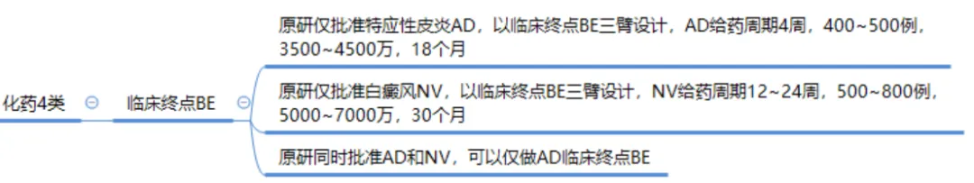 笔者认为原研此次申请进口上市是可以申请优先审评,预计一年时间左右批准,大多数企业可能要按照4类境内申请人仿制已在境内上市原研药品的药品申请了。可以参考FDA个药指南《Draft Guidance on Ruxolitinib Phosphate November 2023 》进行临床终点BE试验。由于原研先申请白癜风适应症,如果明年顺利获批,后续企业可能需要做白癜风的临床终点BE三臂试验,费用和周期较3类仿制是没有优势的,估计多数仿制药企业在此可能会项目终止。所以仿制企业还是赶在原研批准之前赶紧申报吧!