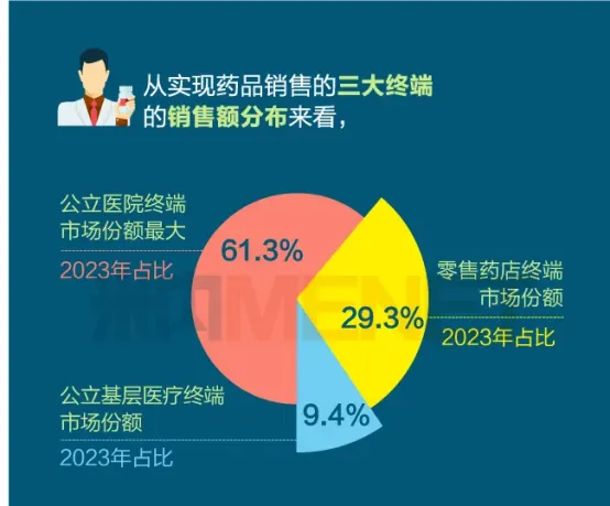 据米内网数据统计,2023年,零售药店终端市场份额占比仍然高达29.3%,基层医疗终端的市场份额也占据了9.4%的份额。
