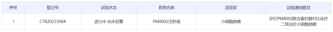 9 月 27 日,药物临床试验登记与信息公示平台显示,普米斯在国内登记一项 Ⅲ 期临床,以评估 PM8002 注射液联合紫杉醇注射液对比化疗二线治疗小细胞肺癌(SCLC)的有效性和安全性。
