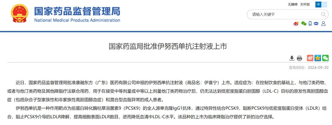 今日(9月30日),中国国家药监局(NMPA)官网宣布康方生物1类新药伊努西单抗注射液(AK102)上市申请已正式获批,适应症为:在控制饮食的基础上,与他汀类药物、或者与他汀类药物及其他降脂疗法联合用药,用于在接受中等剂量或中等以上剂量他汀类药物治疗后,仍无法达到低密度脂蛋白胆固醇(LDL-C)目标的原发性高胆固醇血症(包括杂合子型家族性和非家族性高胆固醇血症)和混合型血脂异常的成人患者。