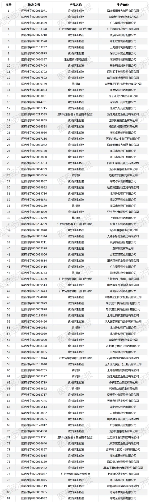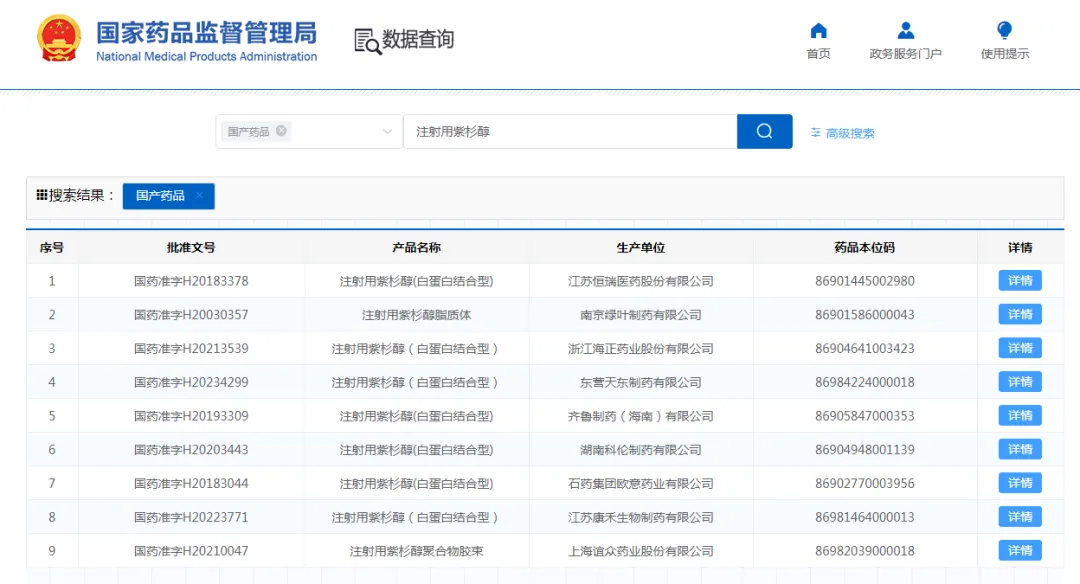在国内,已有多款紫杉醇制剂获批上市,包括紫杉醇注射液、注射用紫杉醇脂质体、注射用紫杉醇聚合物胶束和注射用紫杉醇(白蛋白结合型)。