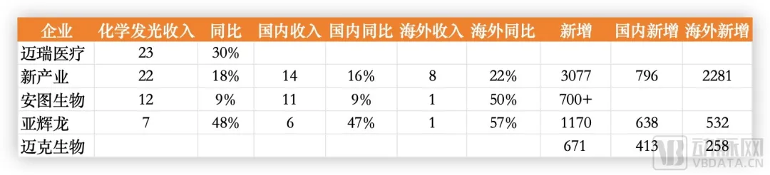 部分IVD企业化学发光板块业绩,数据源自财报