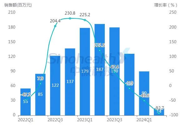 注射用头孢噻肟钠是第八批国采品种。据中康开思系统数据显示,注射用头孢噻肟钠在2023年等级医院市场销售额为18.46亿元,而2024年上半年销售额为2.49亿元,Q2销售额同比下降86.7%,创近五年新低。