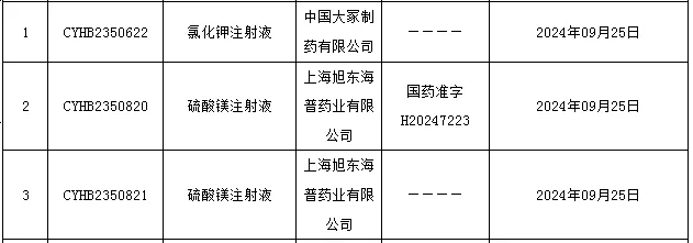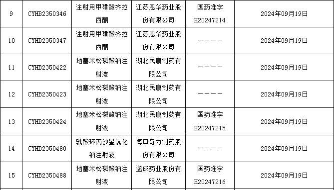 包括马鞍山丰原制药的2品规缩宫素注射液;中嘉生物科技的3品规胞磷胆碱钠注射液;江苏恩华药业的2品规注射用甲磺酸齐拉西酮;湖北民康制药的3品规地塞米松磷酸钠注射液;海口奇力制药的乳酸环丙沙星氯化钠注射液;遂成药业的地塞米松磷酸钠注射液;浙江奥托康医药的3品规氟马西尼注射液;瑞阳制药的2品规注射用头孢噻肟钠;苏州二叶制药的2品规注射用头孢唑林钠;天津怀仁制药的辛伐他汀片;宜昌人福药业的盐酸林可霉素注射液;陕西博森生物制药的2品规酒石酸美托洛尔注射液;苏州弘森药业的2品规螺内酯片;中国大冢制药的氯化钾注射液和上海旭东海普药业的2品规硫酸镁注射液等。