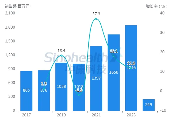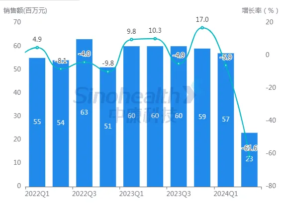硫酸镁注射液是第九批国采品种,据中康开思系统数据显示,硫酸镁注射液在2024年Q2等级医院市场销售额为2300万元,同比下降61.6%。