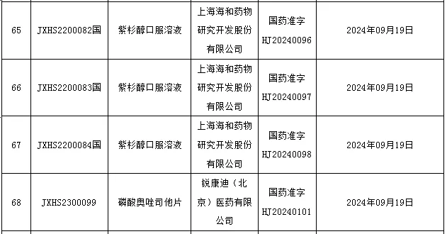 其中,包括四款新药,分别为上海海和药物的3品规紫杉醇口服溶液;锐康迪(北京)的磷酸奥唑司他片。