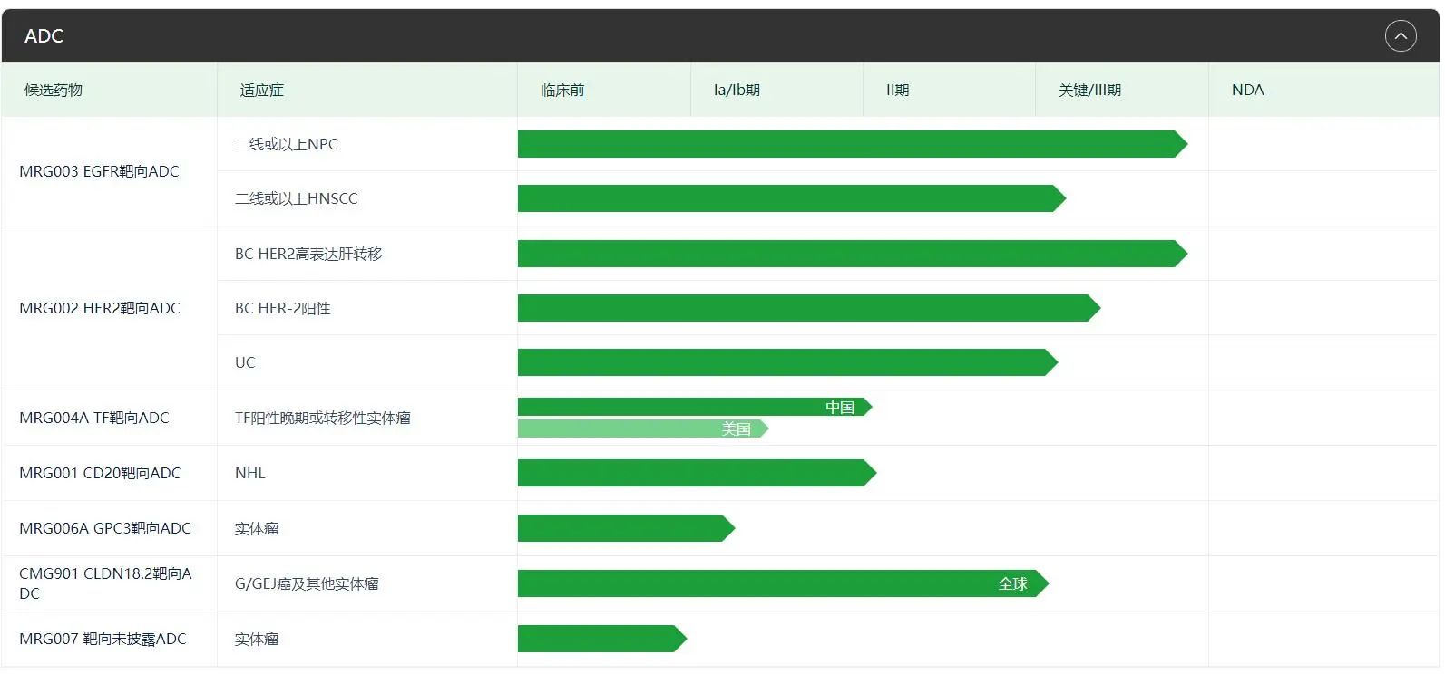 此外,MRG004A(TF-ADC)是国内首款,进度全球第二的TF-ADC,正处于临床Ⅱ期;MRG001(CD20-ADC)全球进度领先,也处于Ⅱ期阶段。