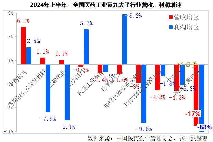 在9个医药工业子行业中,营收、利润实现增长的占1/3(3个子行业),下降的占2/3(6个子行业)。