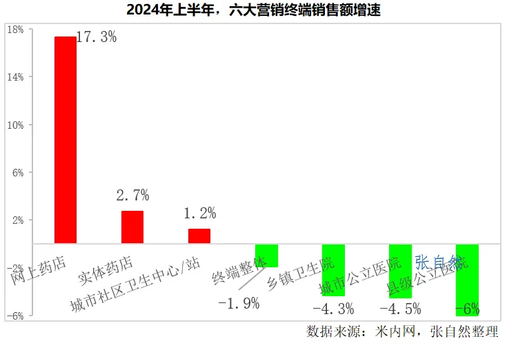 其中,增速最快的仍然是网上药店,增长了17.3%,网上药店多年位居各大营销终端增速之首。降幅最大的是县级公立医院,同比下降了6%。