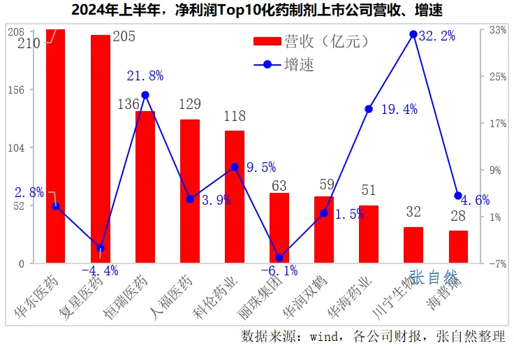 2024年上半年,在净利润Top10化药制剂上市公司中,营收最大的分别是华东医药(209.7亿元)、复星医药(204.6亿元)、恒瑞医药(136亿元)、人福医药(128.6亿元)和科伦药业(118.3亿元),都已过百亿;其次是丽珠集团(62.8亿元)、华润双鹤(59.3亿元)、华海药业(51.3亿元)、川宁生物(32亿元)、海普瑞(28.4亿元)。