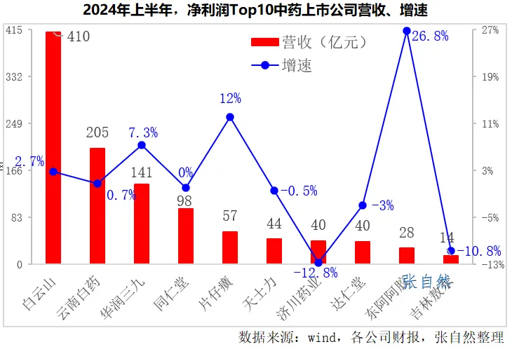 2024年上半年,在净利润Top10中药上市公司中,营收最大的依次是白云山(410.4亿元)、云南白药(204.6亿元)、华润三九(141.1亿元),都在百亿以上。