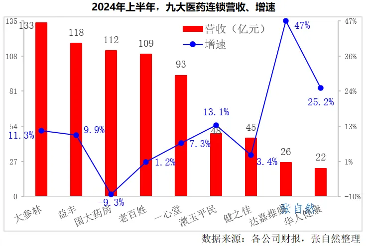 2024年上半年,在9大上市医药连锁企业中,营收最大的是大参林,卖了133.45亿元,营收增速最快的是达嘉维康,增长了47%。