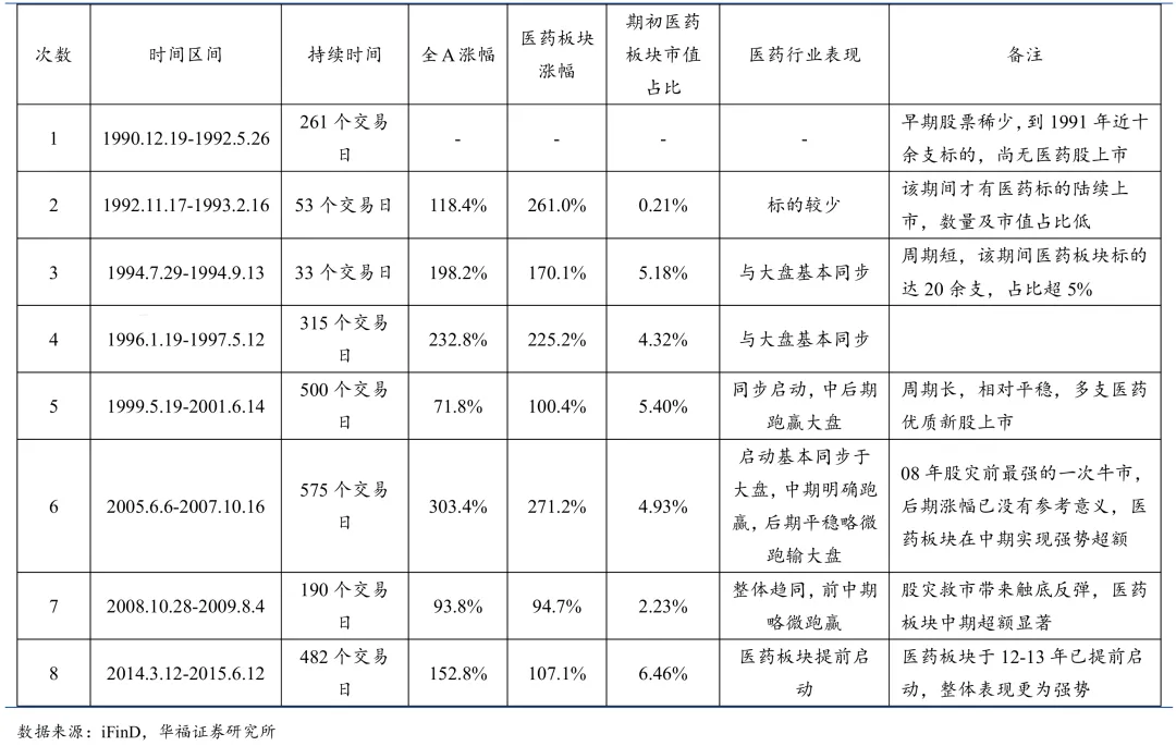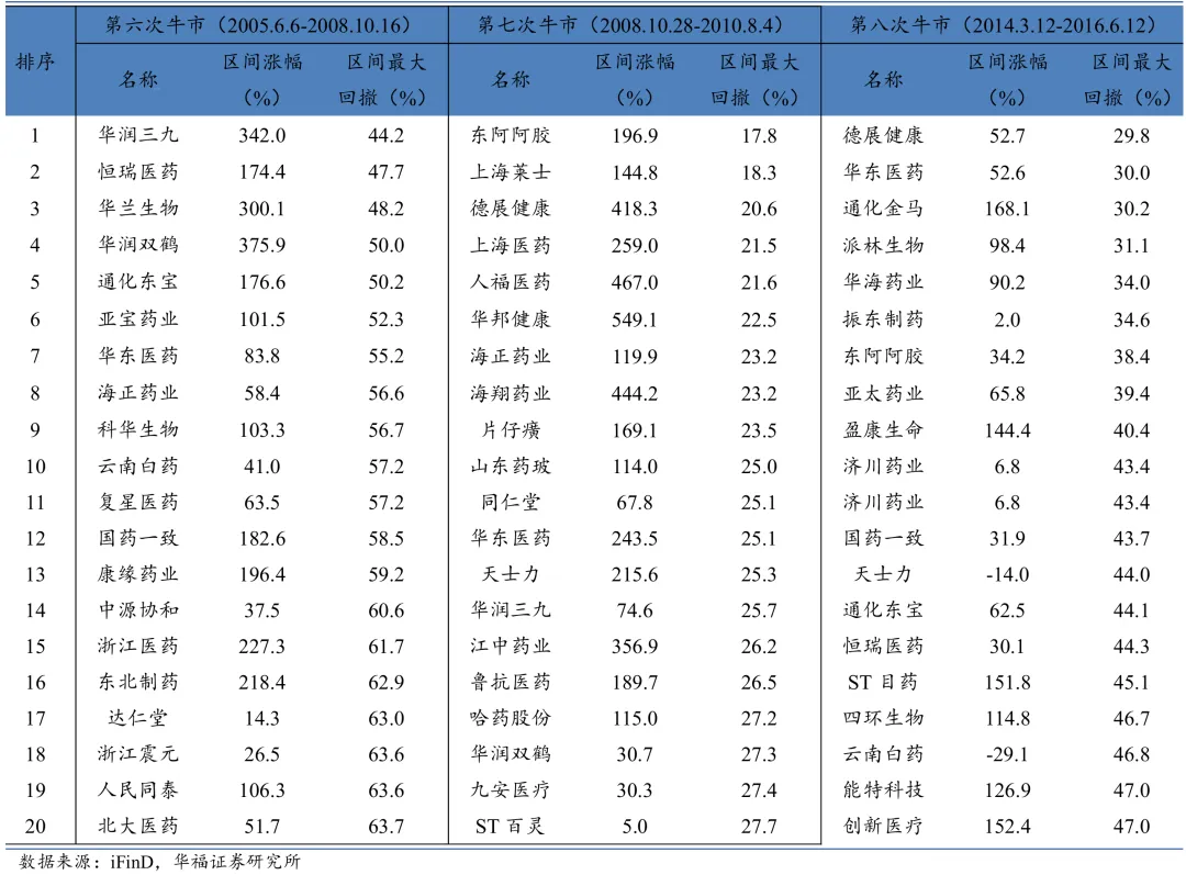 据华福证券统计,A股前4次牛市,医药板块标的较少,参考意义不强;第5次起医药板块主要体现为前期启动不输大盘,中期较多跑出超额收益的情形;第6次2005年牛市,医药板块跑输,但中早期强于大盘;第7次2008年牛市,医药同步大盘,但熊市后医药创新高,远超大盘;第8次2014年牛市虽跑输大盘,但医药已提前1-2年走牛。每次牛市结束后,即使是最稳健的医药标的,回撤幅度也是惊人的。