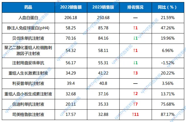 值得注意的是,人血白蛋白、利妥昔单抗注射液在激烈的竞争形势下,2023年保持排名不变。