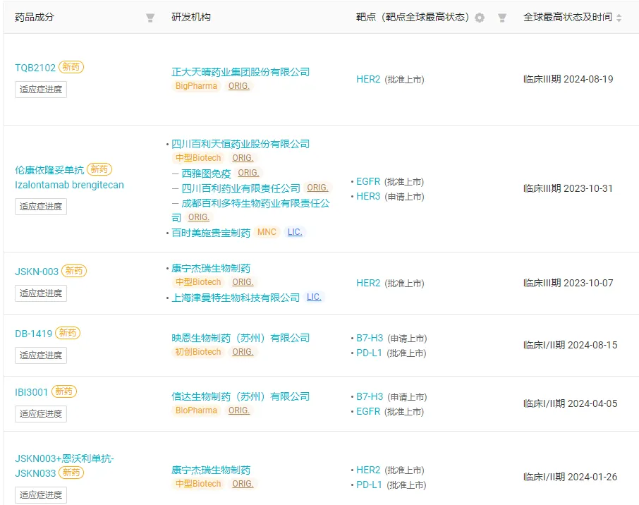 作为先行者的百利天恒、石药集团/康宁杰瑞,正在努力争夺首款双抗 ADC 的「宝座」,正大天晴、翰森制药等也抢滩布局。