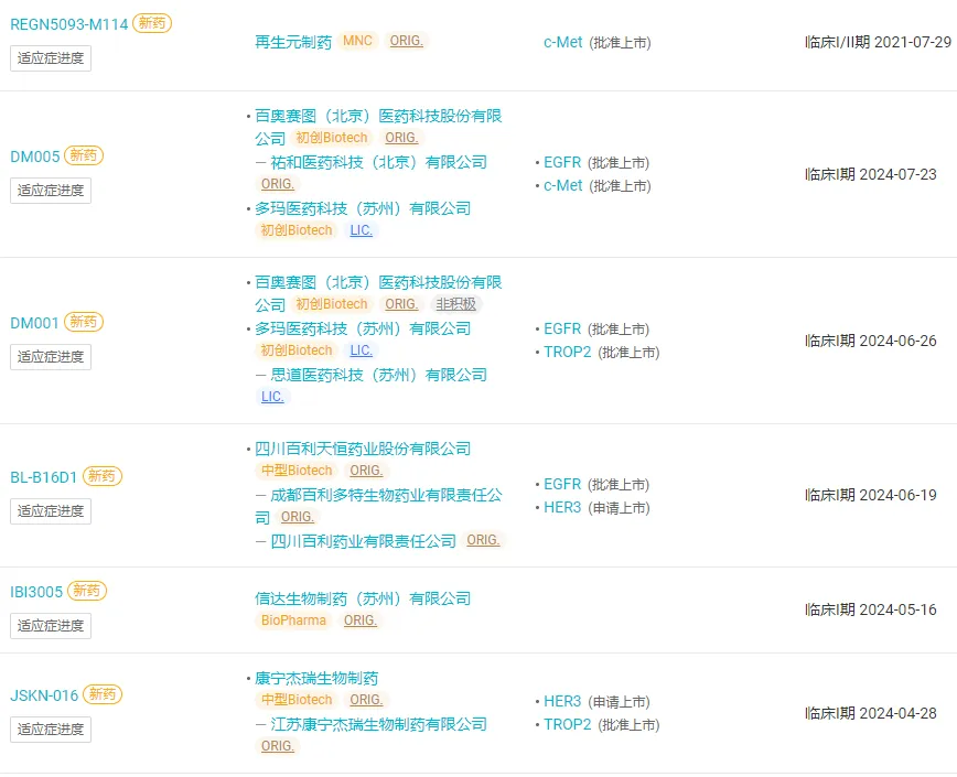 因此,当前很多企业都在开发能够同时靶向 EGFR 和 c-MET 的药物,以期为 NSCLC 肺癌患者带来更好的治疗选择。Insight 数据库显示,全球范围内已有十多款同时靶向 EGFR 和 c-MET 的药物进入申报临床及其以上阶段,药物类型包括双抗、三抗、ADC。