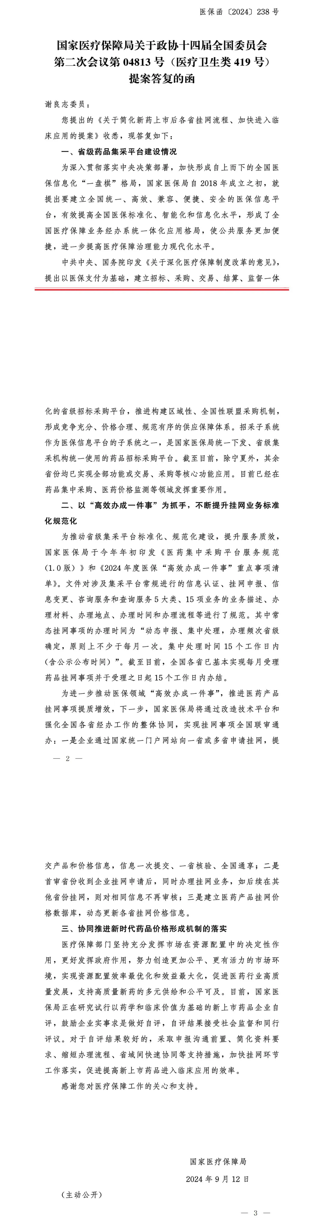 近日,国医保局官网发布《国家医疗保障局关于政协十四届全国委员第二次会议第04813号(医疗卫生类419号)提案答复的函》(医保函〔2024〕238号),就“不断提升挂网业务标准化规范化”明确挂网三件事,下一步,国家医保局将通过改造技术平台和强化全国各省经办工作的整体协同,实现挂网事项全国联审通办: