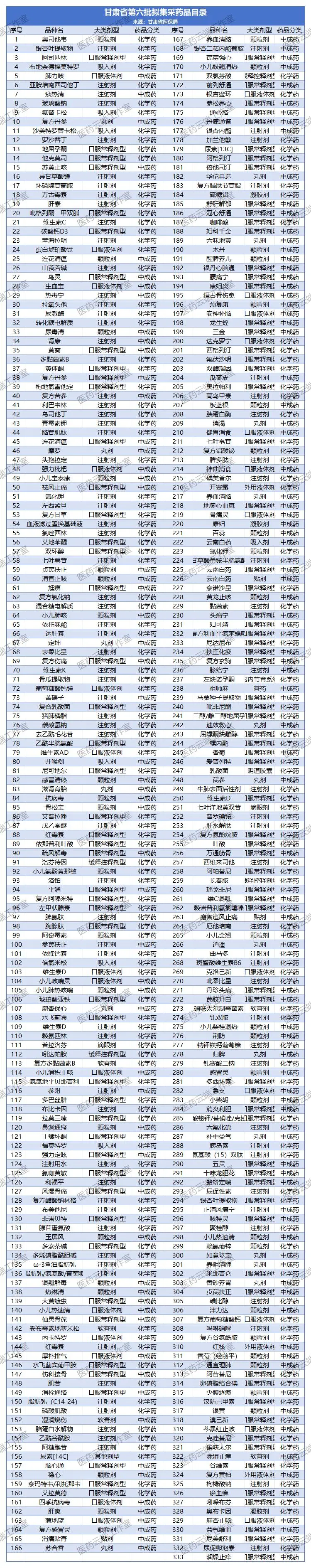甘肃此次拟纳入集采的品种共333个,其中化学药188个,中成药145个。按甘肃集采药品“查漏补缺”的原则,化学药纳入的条件是其他省份已集采+过评数≤4,包括奥司他韦颗粒剂、银杏叶提取物注射剂、布地奈德福莫特罗吸入剂等品种。