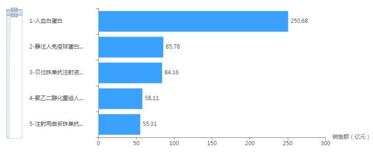 TOP3品种来看,人血白蛋白、静注人免疫球蛋白(pH4)、贝伐珠单抗注射液占据前三。