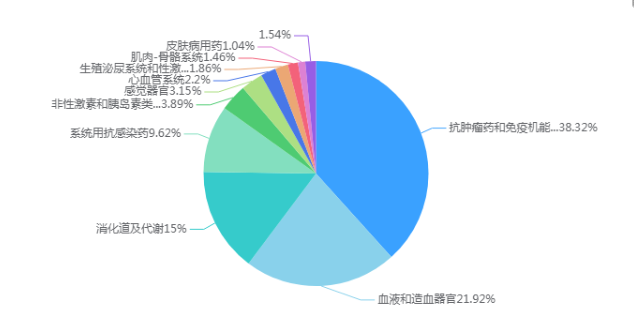 就2023年生物药ATC分类销售额来看,抗肿瘤和免疫机能调节药占比第一、为38.32%,第二为血液和造血器官类药物、占比21.92%,第三为消化道及代谢药物、占比15%。