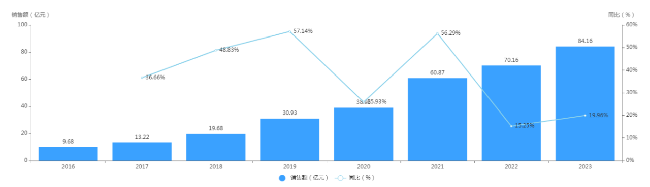 药智数据显示,2016年—2023年,贝伐珠单抗注射液的国内公立医疗机构销售额高达327.65亿元,销售额一路飙升,从几亿元级别到80亿元级别仅仅用了8年时间,正朝着年销售额100亿元的目标迈进。
