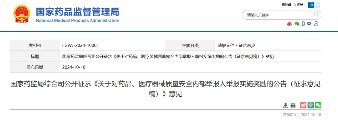 昨日(10月10日),国家药监局综合司发布公开征求《关于对药品、医疗器械质量安全内部举报人举报实施奖励的公告(征求意见稿)》意见。
