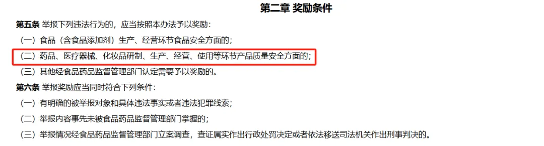 为进一步发挥药品、医疗器械产业链质量安全内部监督作用,及时发现和控制药品、医疗器械安全风险,根据《中华人民共和国药品管理法》《中华人民共和国疫苗管理法》《医疗器械监督管理条例》等法律法规以及《市场监管领域重大违法行为举报奖励暂行办法》(国市监稽规〔2021〕4号,以下简称《办法》)等规范性文件规定,现就药品、医疗器械质量安全内部举报人举报奖励有关事项公告如下。