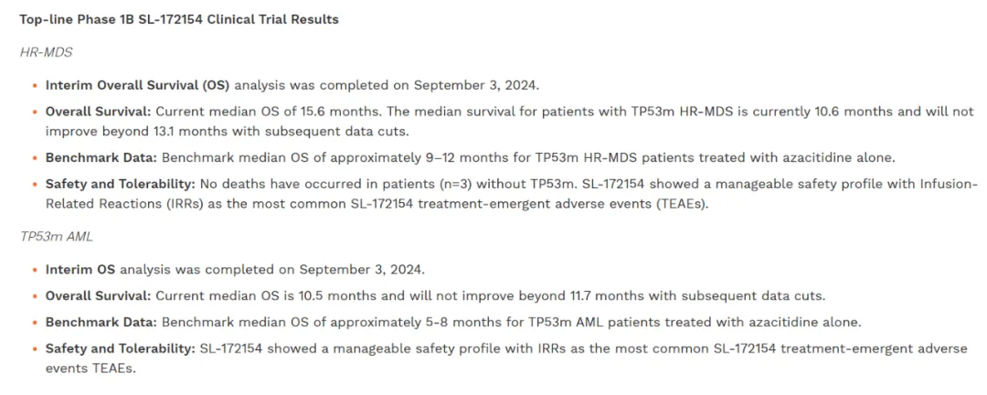 原因是在治疗TP53突变的急性髓性白血病(TP53m AML)和高危骨髓增生异常综合症(TP53m HR-MDS)患者的Ⅰb期临床试验中,SL-172154仅对患者中位OS显示出轻微的改善。