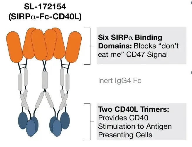 SL-172154 (SIRPα-Fc-CD40L)是Shattuck研发一种六聚体双功能融合蛋白,由SIRPα结构域通过惰性Fc连接体连接到CD40L结构域组成,旨在通过同时抑制CD47/SIRPα检查点和激活CD40共刺激受体增强肿瘤患者的抗肿瘤免疫反应。2024年6月,SL-172154获得FDA授予的孤儿药资格,用于治疗AML。
