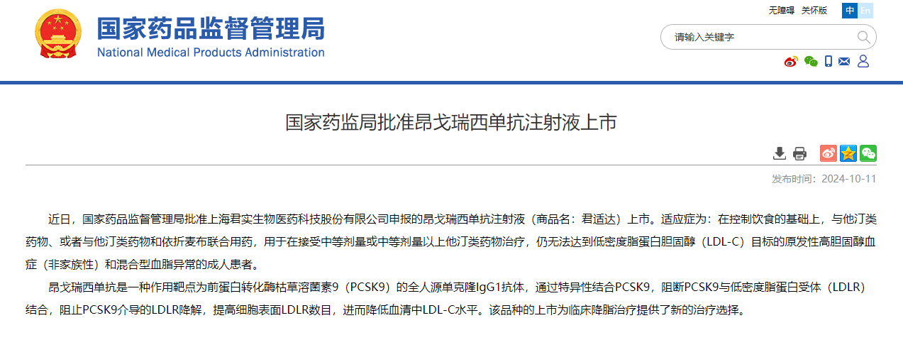10 月 11 日,NMPA 官网显示,君实生物昂戈瑞西单抗获批上市,应症为:在控制饮食的基础上,与他汀类药物、或者与他汀类药物和依折麦布联合用药,用于在接受中等剂量或中等剂量以上他汀类药物治疗,仍无法达到低密度脂蛋白胆固醇(LDL-C)目标的原发性高胆固醇血症(非家族性)和混合型血脂异常的成人患者。
