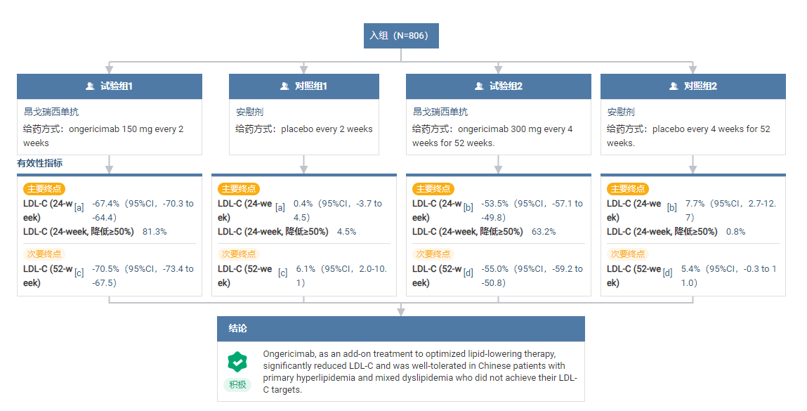 研究结果显示,昂戈瑞西单抗 150 mg 每 2 周一次(Q2W)皮下注射,可显著降低低密度脂蛋白胆固醇(LDL-C)水平达 67.4% ,在 52 周治疗期间始终维持稳定的降幅,同时对其他血脂参数也有明显的改善作用。安全性良好,治疗期间出现的不良事件(TEAE)的发生率与安慰剂相当。