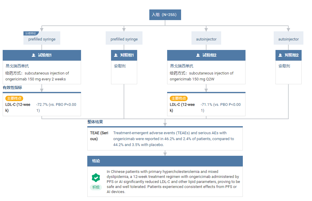 5 月 17 日,发表在 NMCD 杂志上的 Ⅲ 期临床研究(JS002-003)数据显示,两种给药方式下(预充式注射器(PFS)皮下注射和预充式自动注射器(AI)皮下注射),昂戈瑞西单抗均表现出相当的显著降脂作用。与安慰剂相比,患者接受昂戈瑞西单抗每 2 周一次(Q2W)治疗 12 周时,受试者 LDL-C 水平均显著降低 70% 以上(PFS 组 72.7%,AI 组 71.1%),且安全性良好。