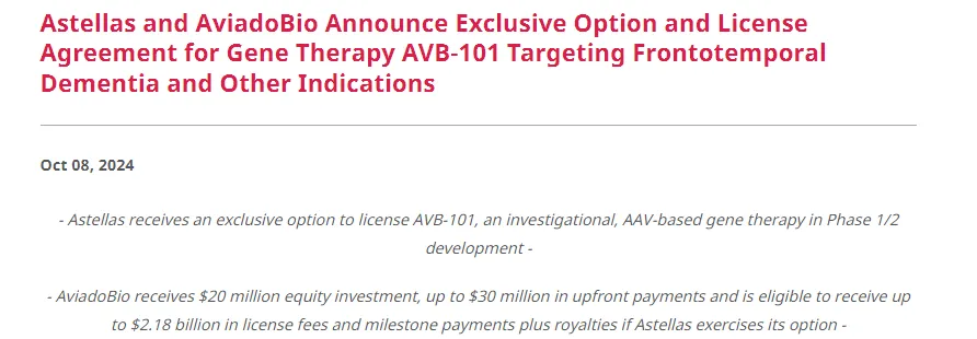 2024年10月8日,AviadoBio和安斯泰来宣布就AVB-101达成一项独家选择权和许可协议。AVB-101是一种基于AAV的基因疗法,用于治疗GRN基因突变额颞叶痴呆(GRN-FTD)患者。