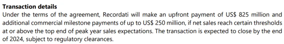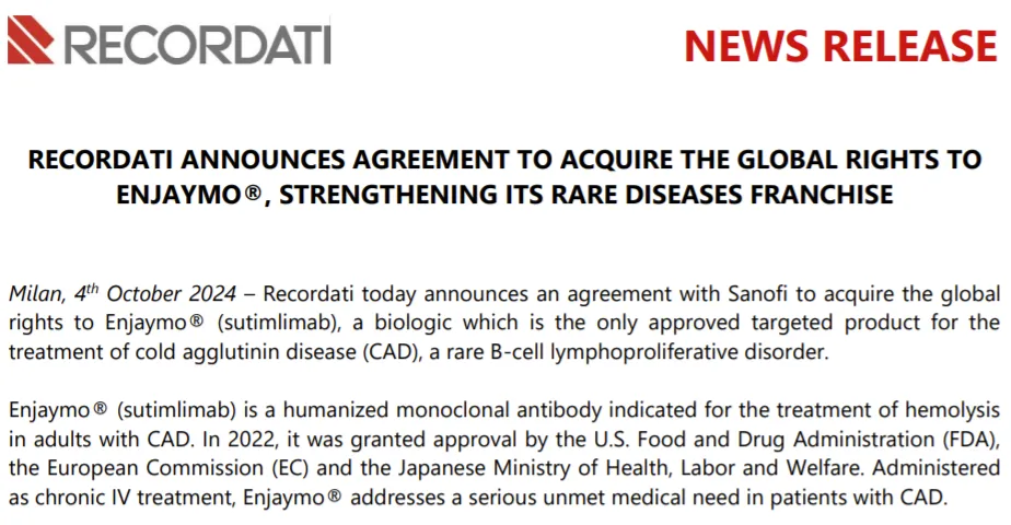2024年10月4日,赛诺菲将补体C1s抗体药物Enjzymo的全球权益出售给意大利老牌药企Recordati,后者支付8.25亿美元预付款,2.5亿美元商业里程碑金额。