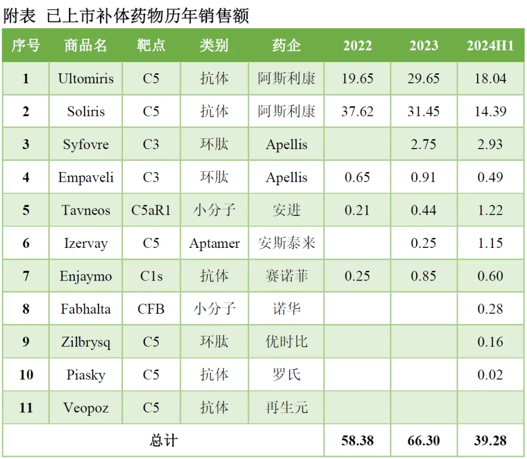 2023年全球补体药物市场规模为66.3亿美元,2024年上半年为39.3亿美元,赛诺菲C1s抗体Enjaymo 2023年销售额为0.85亿美元,2024年上半年销售额为0.60亿美元。