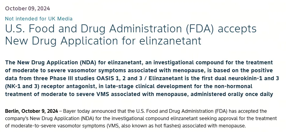 10月9日,拜耳宣布美国FDA已受理双重NK-1/NK-3受体拮抗剂Elinzanetant(依林奈坦)的新药上市申请(NDA),适应症为更年期相关的中度至重度血管舒缩症状(VMS),即更年期潮热。
